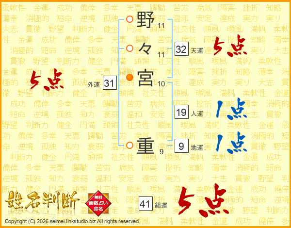 生活面を象徴する運勢です。外部から受ける影響力を表し、結婚運、家庭運や職場、環境への順応性を表します。総運から人運を引いた画数。姓や名が1文字の場合を除く。