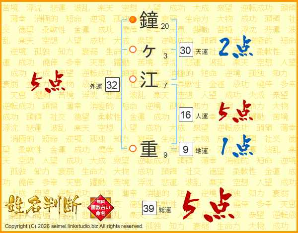鐘ヶ江重さんの総運は39画の5点!