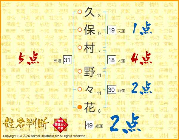 久(3画)保(9画)村(7画) 野(11画)々(11画)花(8画)