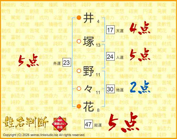 井塚野々花さんの総運は47画の5点!