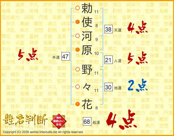 勅(11画)使(8画)河(9画)原(10画) 野(11画)々(11画)花(8画)