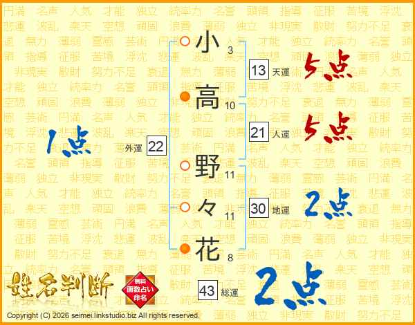 小高野々花さんの総運は43画の2点!