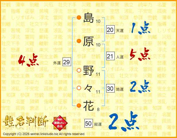 島(10画)原(10画) 野(11画)々(11画)花(8画)