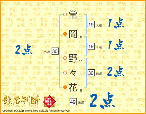 常(11画)岡(8画) 野(11画)々(11画)花(8画)