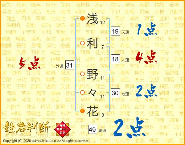 浅利野々花さんの総運は49画の2点!