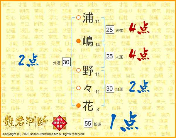 浦(11画)嶋(14画) 野(11画)々(11画)花(8画)