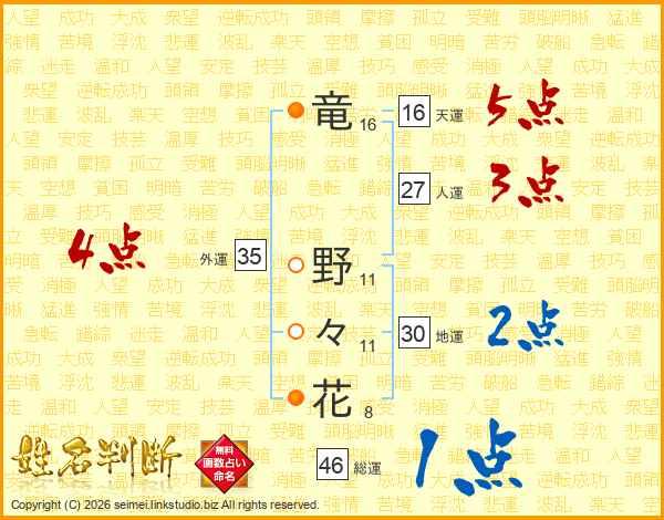 竜(16画) 野(11画)々(11画)花(8画)