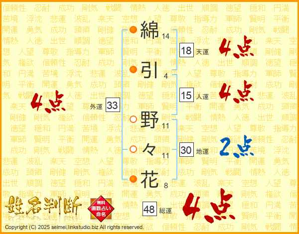 綿引野々花さんの総運は48画の4点!