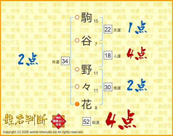 駒(15画)谷(7画) 野(11画)々(11画)花(8画)