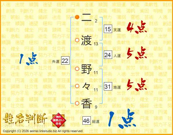 二(2画)渡(13画) 野(11画)々(11画)香(9画)