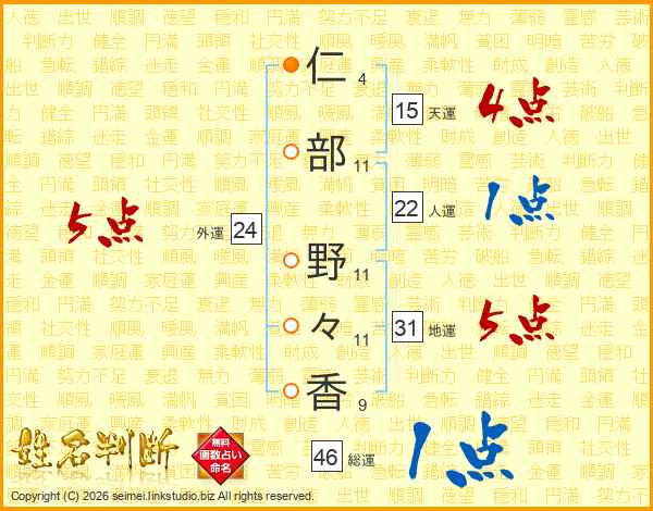 仁(4画)部(11画) 野(11画)々(11画)香(9画)