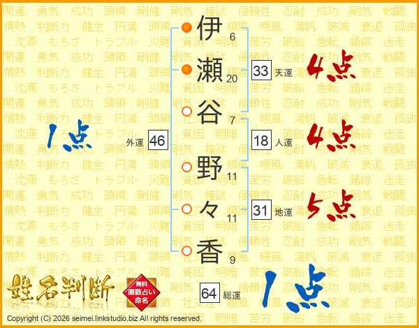 伊瀬谷野々香さんの総運は64画の1点!