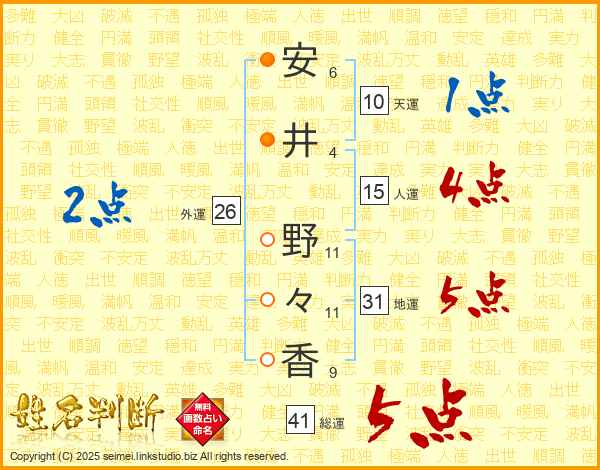 安(6画)井(4画) 野(11画)々(11画)香(9画)