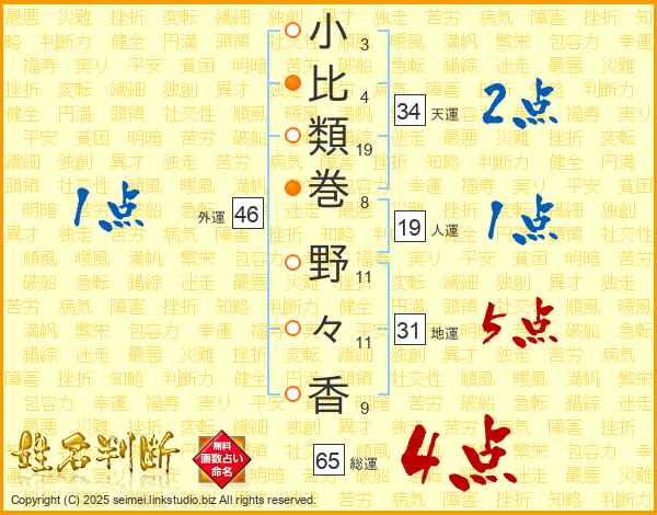 小(3画)比(4画)類(19画)巻(8画) 野(11画)々(11画)香(9画)