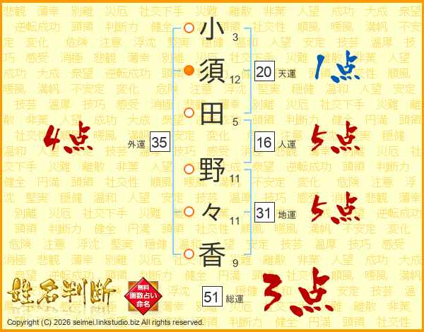小(3画)須(12画)田(5画) 野(11画)々(11画)香(9画)