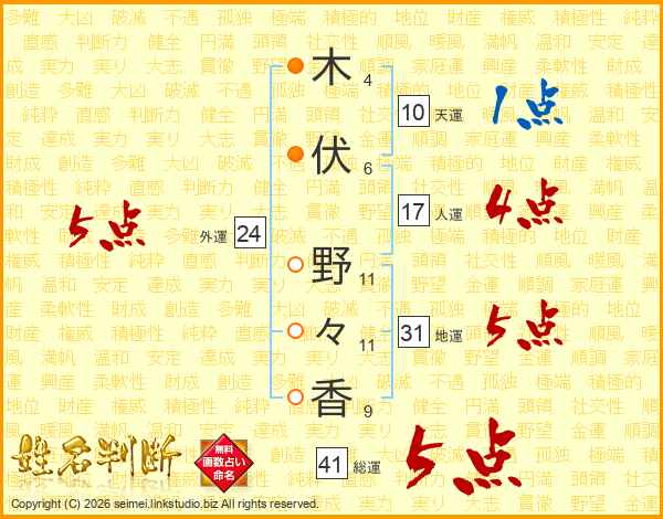 木(4画)伏(6画) 野(11画)々(11画)香(9画)
