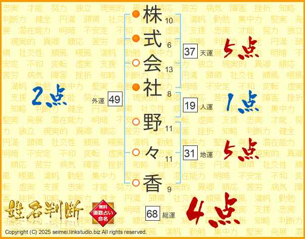 株(10画)式(6画)会(13画)社(8画) 野(11画)々(11画)香(9画)