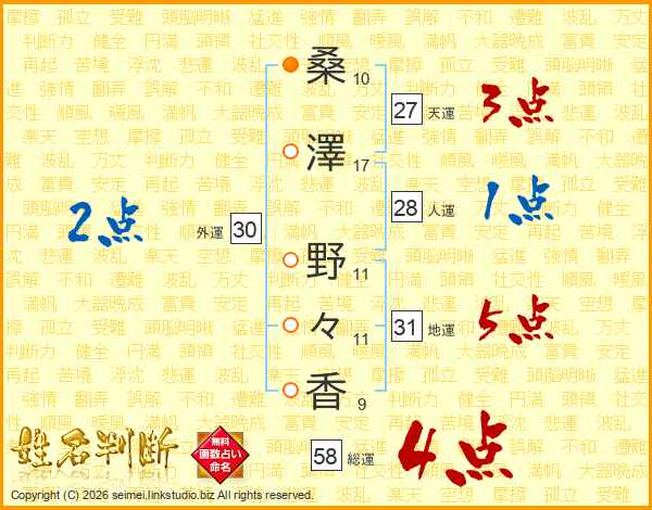 桑(10画)澤(17画) 野(11画)々(11画)香(9画)