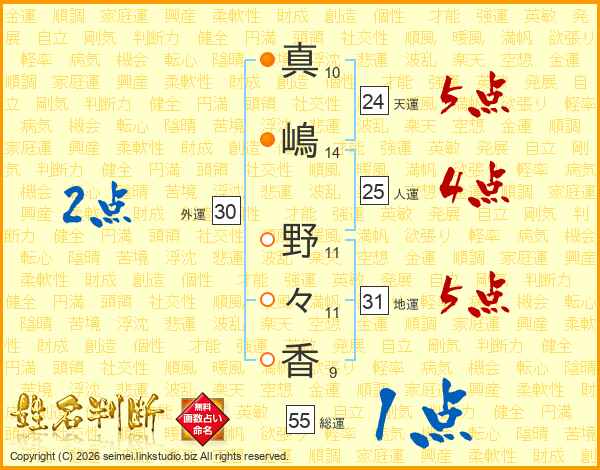 真(10画)嶋(14画) 野(11画)々(11画)香(9画)