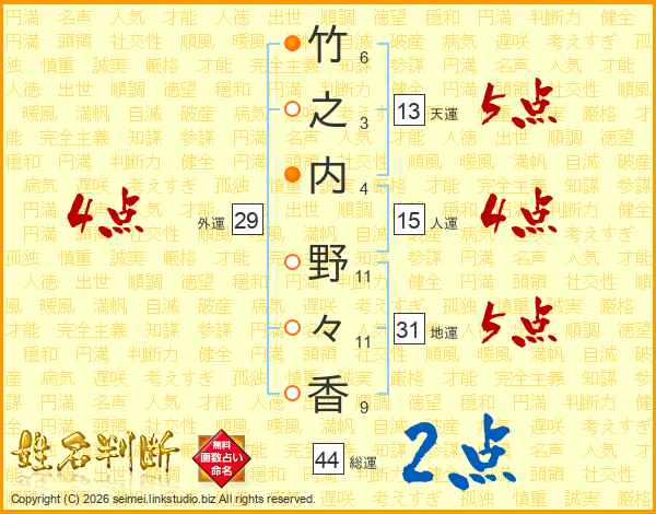 竹(6画)之(3画)内(4画) 野(11画)々(11画)香(9画)
