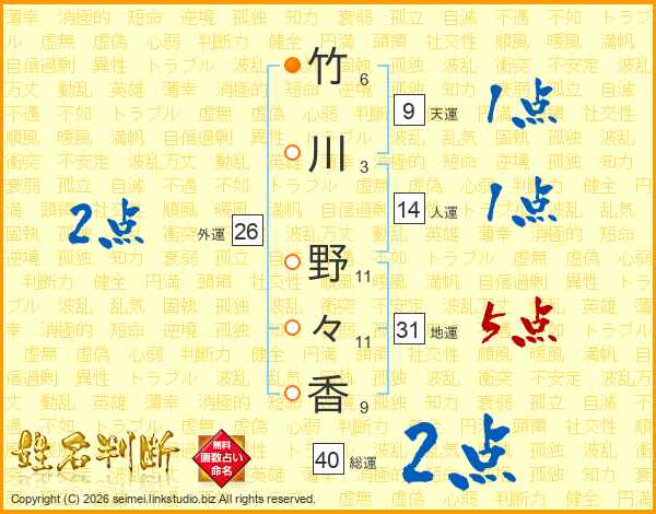 竹(6画)川(3画) 野(11画)々(11画)香(9画)