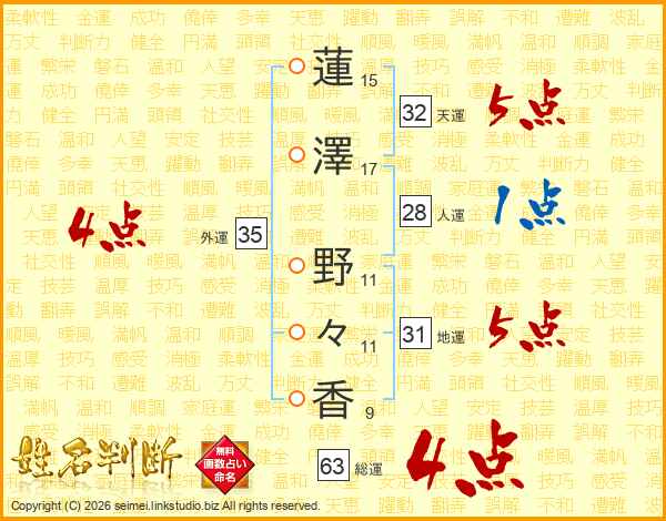 蓮(15画)澤(17画) 野(11画)々(11画)香(9画)
