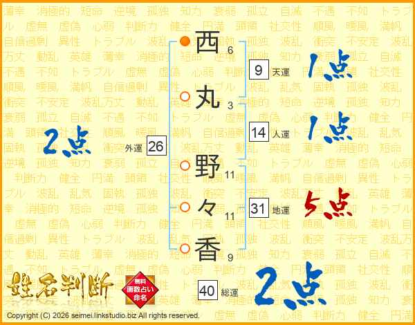 西(6画)丸(3画) 野(11画)々(11画)香(9画)