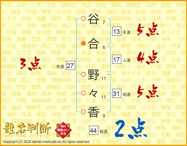 谷(7画)合(6画) 野(11画)々(11画)香(9画)