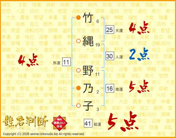 竹(6画)縄(19画) 野(11画)乃(2画)子(3画)