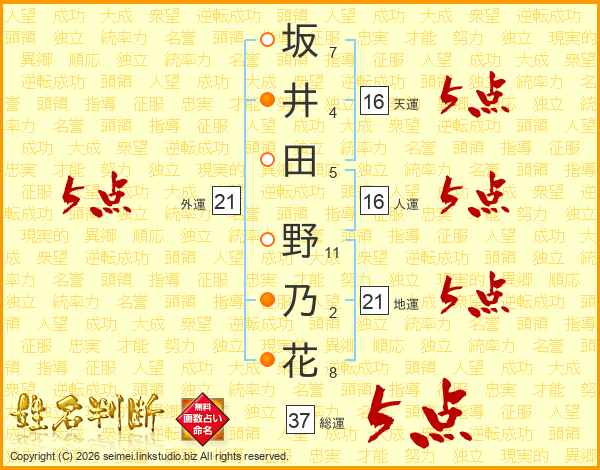 坂(7画)井(4画)田(5画) 野(11画)乃(2画)花(8画)
