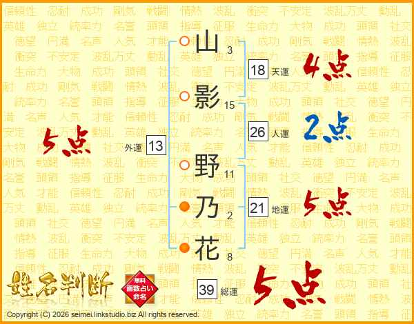 山(3画)影(15画) 野(11画)乃(2画)花(8画)
