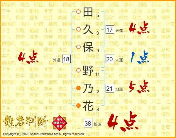 田(5画)久(3画)保(9画) 野(11画)乃(2画)花(8画)