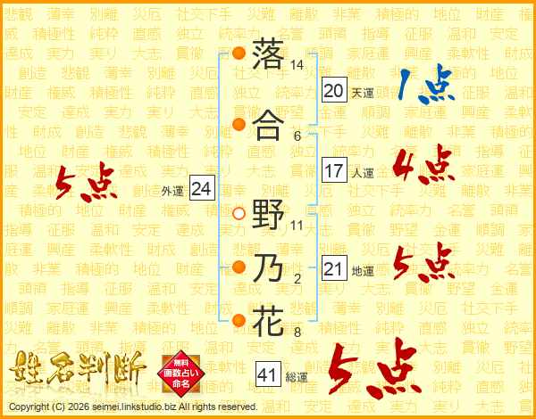 落(14画)合(6画) 野(11画)乃(2画)花(8画)