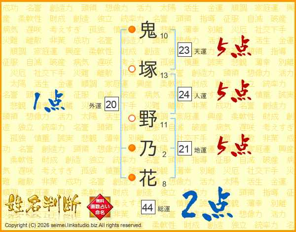 鬼(10画)塚(13画) 野(11画)乃(2画)花(8画)
