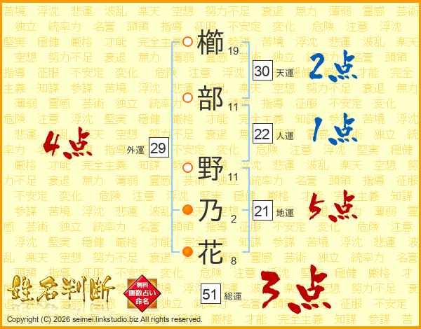生活面を象徴する運勢です。外部から受ける影響力を表し、結婚運、家庭運や職場、環境への順応性を表します。総運から人運を引いた画数。姓や名が1文字の場合を除く。