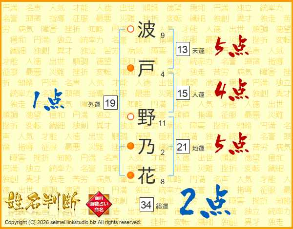 波(9画)戸(4画) 野(11画)乃(2画)花(8画)