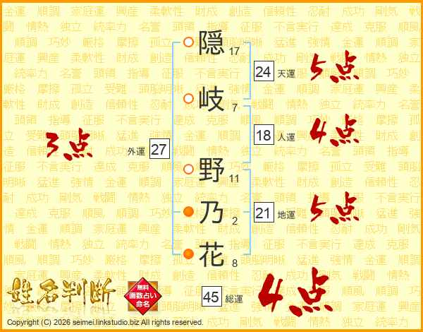 隠(17画)岐(7画) 野(11画)乃(2画)花(8画)