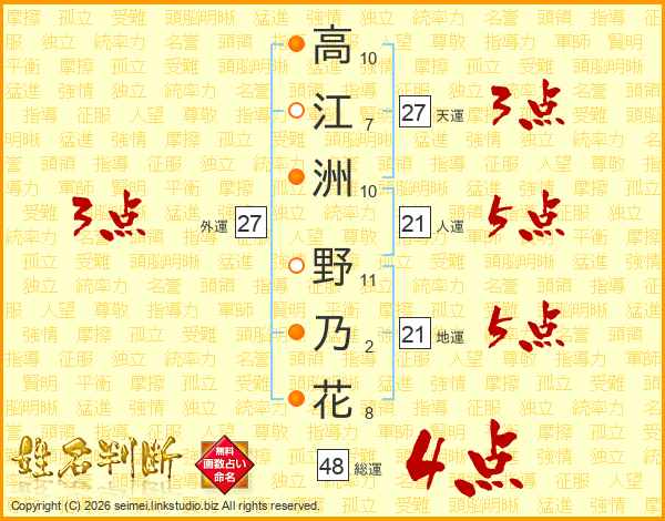 高(10画)江(7画)洲(10画) 野(11画)乃(2画)花(8画)