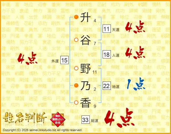 升(4画)谷(7画) 野(11画)乃(2画)香(9画)