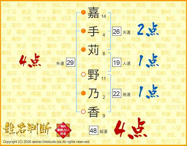 嘉(14画)手(4画)苅(8画) 野(11画)乃(2画)香(9画)