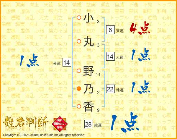 小(3画)丸(3画) 野(11画)乃(2画)香(9画)