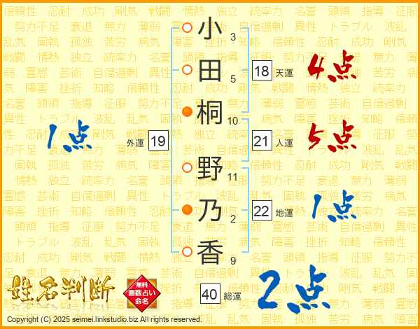 小田桐野乃香さんの総運は40画の2点!