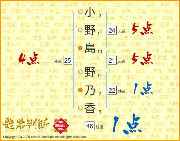 小(3画)野(11画)島(10画) 野(11画)乃(2画)香(9画)