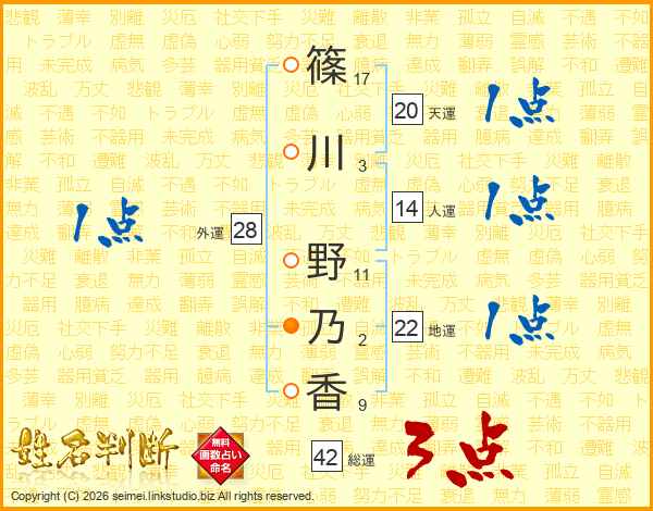 篠(17画)川(3画) 野(11画)乃(2画)香(9画)