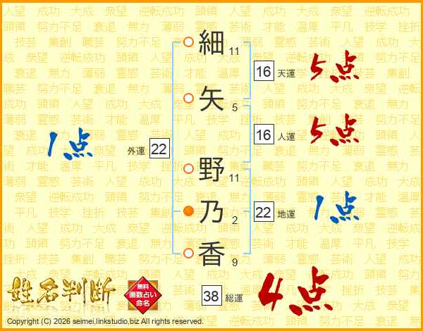 細矢野乃香さんの総運は38画の4点!