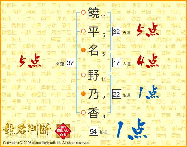 饒(21画)平(5画)名(6画) 野(11画)乃(2画)香(9画)