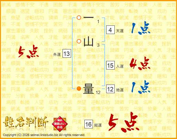 一山量さんの総運は16画の5点!