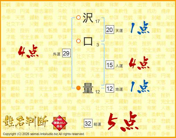 生活面を象徴する運勢です。外部から受ける影響力を表し、結婚運、家庭運や職場、環境への順応性を表します。総運から人運を引いた画数。姓や名が1文字の場合を除く。