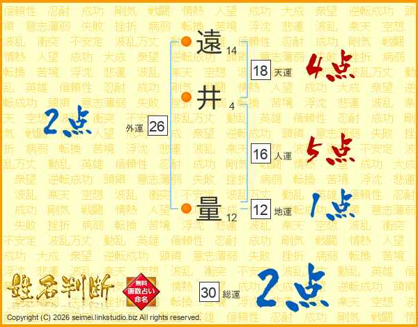 生活面を象徴する運勢です。外部から受ける影響力を表し、結婚運、家庭運や職場、環境への順応性を表します。総運から人運を引いた画数。姓や名が1文字の場合を除く。