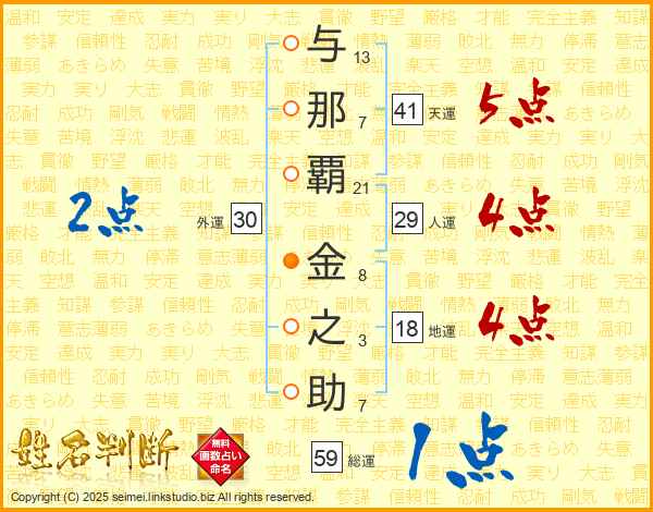 与(13画)那(7画)覇(21画) 金(8画)之(3画)助(7画)